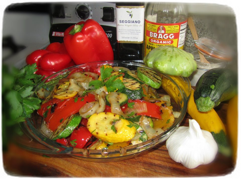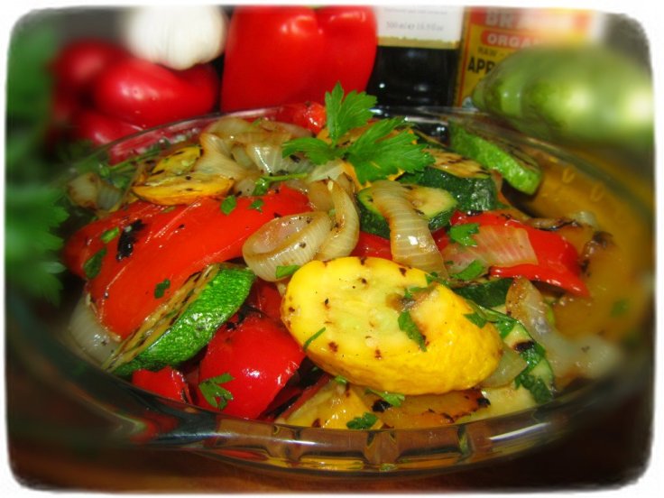 - Place grilled zucchini, red peppers and Vidalia onion slices into a clean mixing bowl. Add the parsley, garlic, vinegar and salt. Mix well and enjoy!